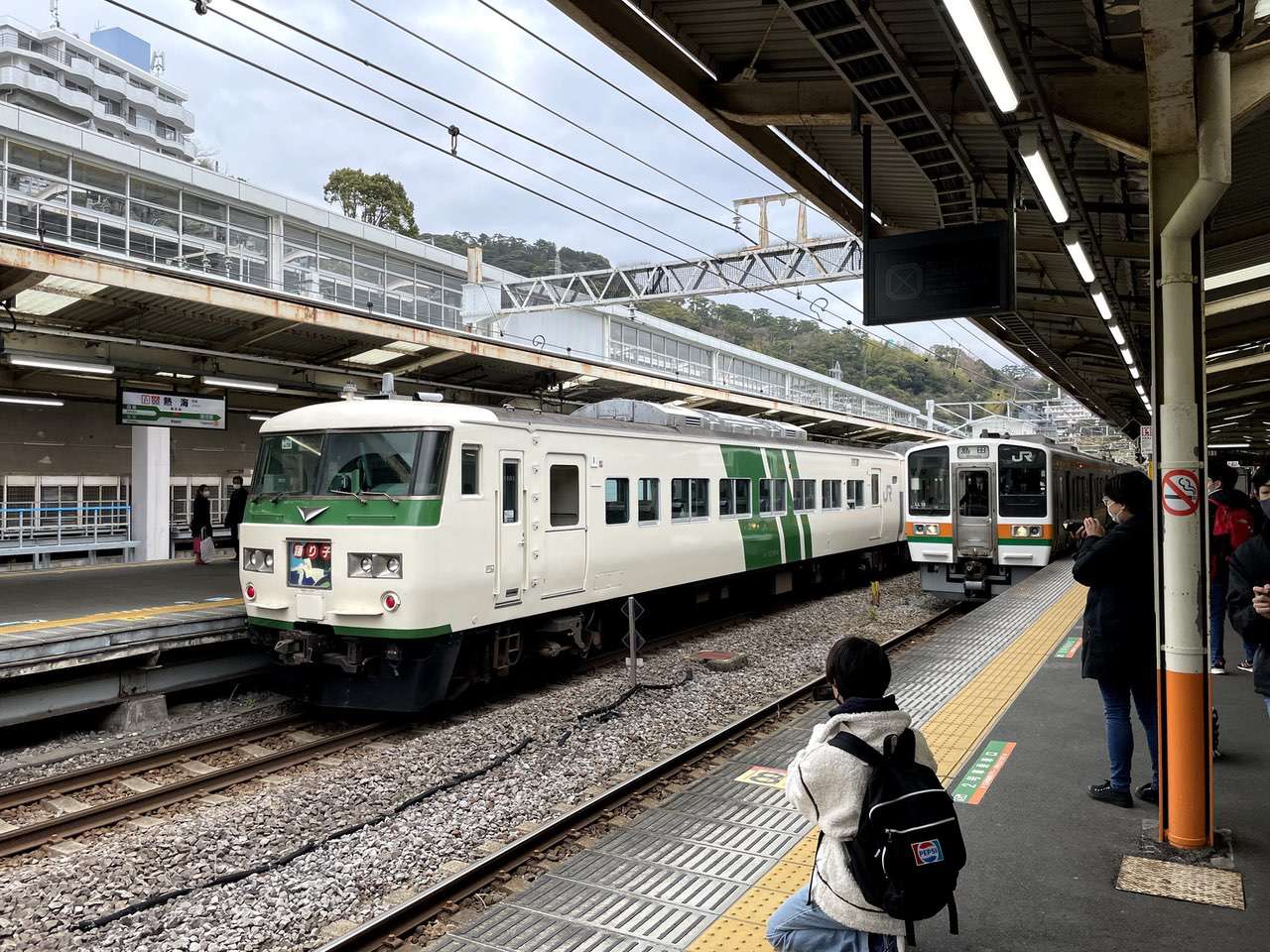沼津まで直通する列車は一日に数本しかありませんので、概ね熱海駅で乗換が必用になります。ここからはJR東海の管轄になります。この日は写真に写っている緑色のストライプが入った車両、これがまもなく引退とのことで写真に収めている人が大変多かったです。撮り鉄の方以外にも一般人とみられる人々もスマホで写真を撮られていたのでそれだけ愛されていたんだなと思いました。