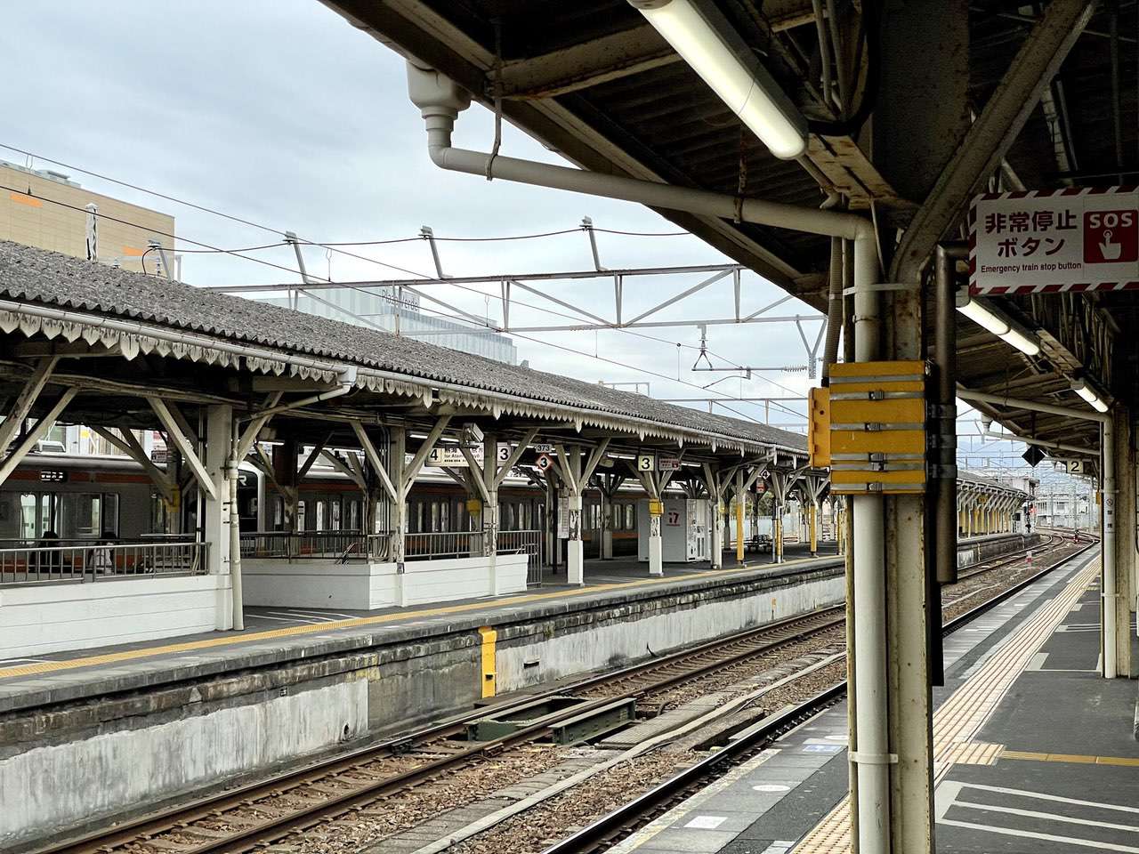 東京から二時間と少々、沼津駅に到着しました。ふと隣のホームを見たのですが屋根を支えてるのは木製の柱でしょうか?だとするとかなり昔から使っている設備なのでしょう。早速、駅のホームから歴史を感じてきます。