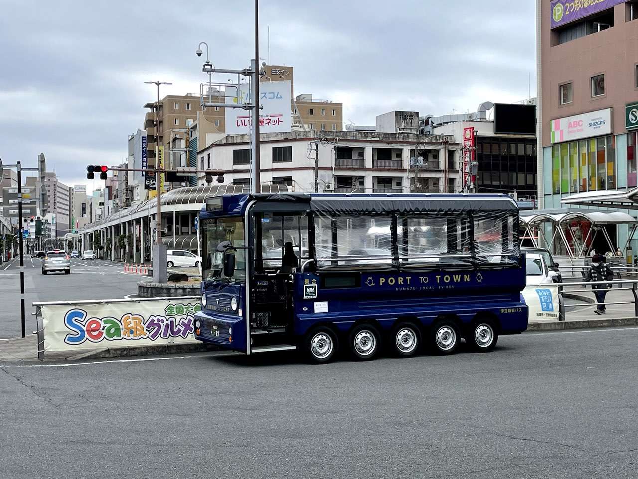沼津駅を出ると駅前に異様にタイヤが多いバス?のような物が止まっています。聞くところによるとこれは電気バス(EVバス)のようで、沼津港までのバス路線に一日6本充当されているようです。