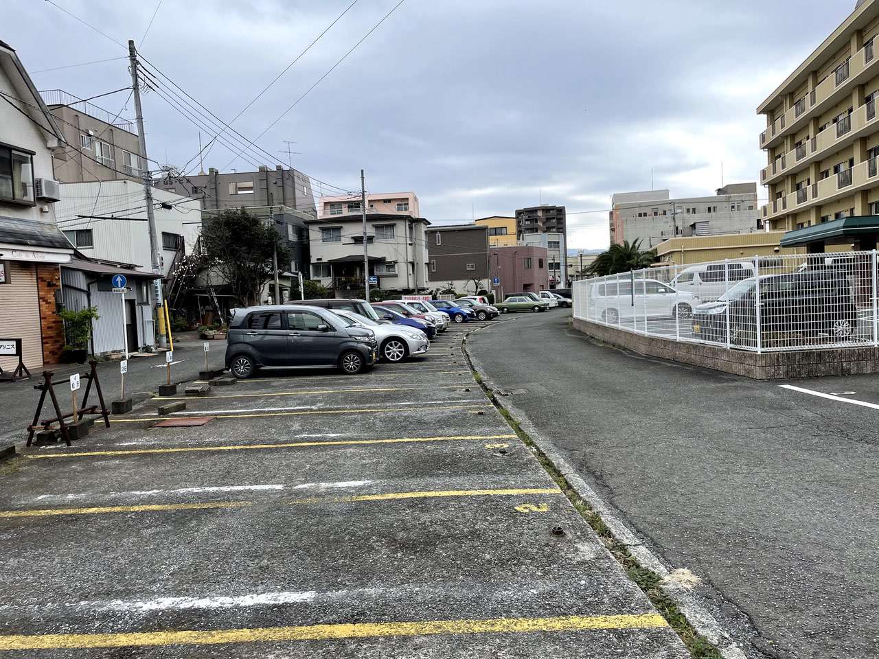その道中、これもまた気になる駐車場が現れました。少しカーブを描いた珍しい形の駐車場です。この形、このカーブ、こういうのは廃線跡、もしくは暗渠の可能性が大変高いです。ちょっとカーブが強いので暗渠でしょうか?