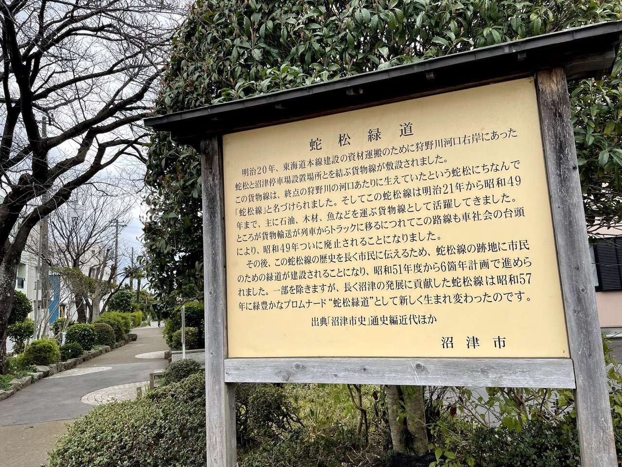 予想通り鉄道路線の廃路線跡でした。しかし予想外だったのがこの路線のできた年代です。案内板によると東海道本線建設のための資材運搬路線として誕生と書いています。つまりこの路線は東海道線よりも歴史があるという事になります。調べると静岡県で最初に蒸気機関が走った場所、それがここのようです。
