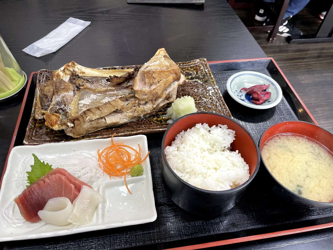 回転寿司を探そうとしたそのとき、ふと一軒の定食屋さんが目に付きました。正確にはそのなかのメニューの「まぐろのカマ塩焼き定食」が気になりました。こういうカマや中落ちなどはこういう漁港近くの定食屋などに行かなければあまり食べる事ができません。よし、今日はまぐろのカマにしよう。