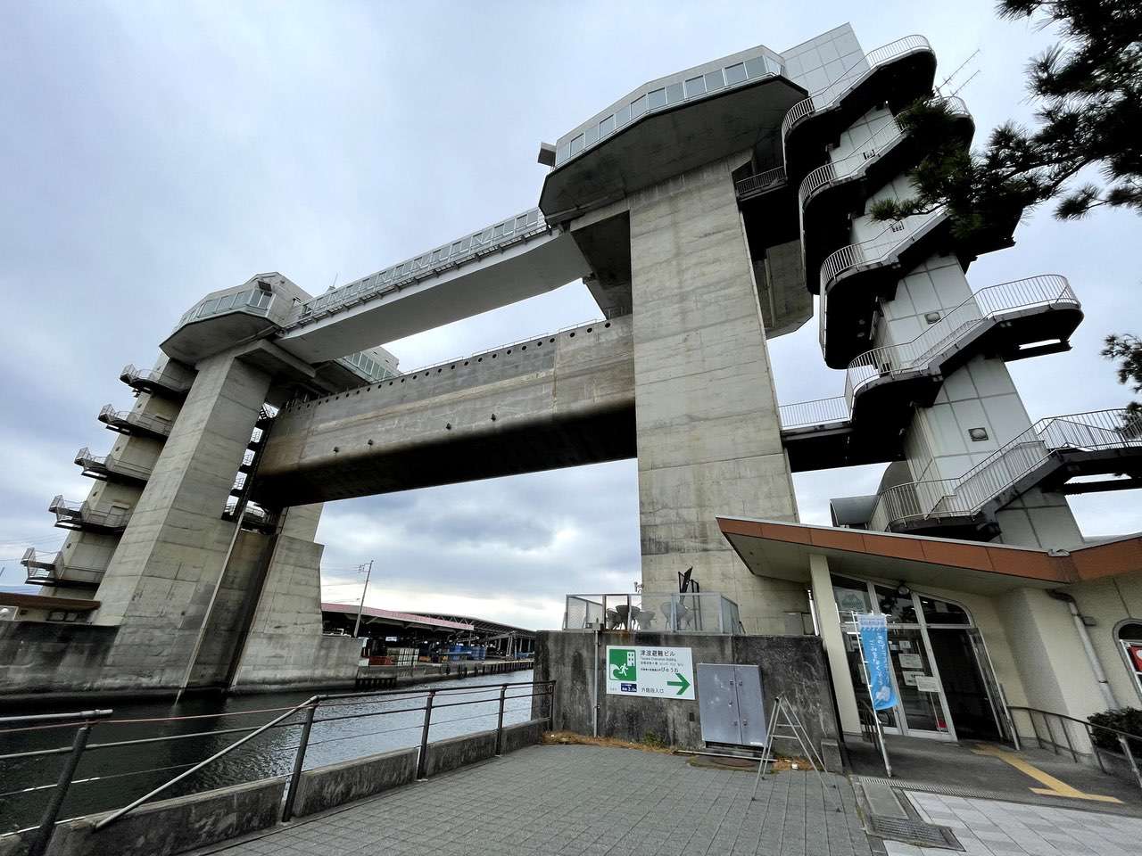 というわけでびゅうおの下までやってきました。こちらは見た目のとおり大型の水門なのですが、最上部が展望台になっていてこの辺りでは一番高いところから景色を楽しめます。近くにある千本松原や晴れていれば富士山もよく見えると思います。そう晴れていれば……。こちらも100円と安価ではありますが有料の施設となるので曇天の時にいくのはちょっと……。